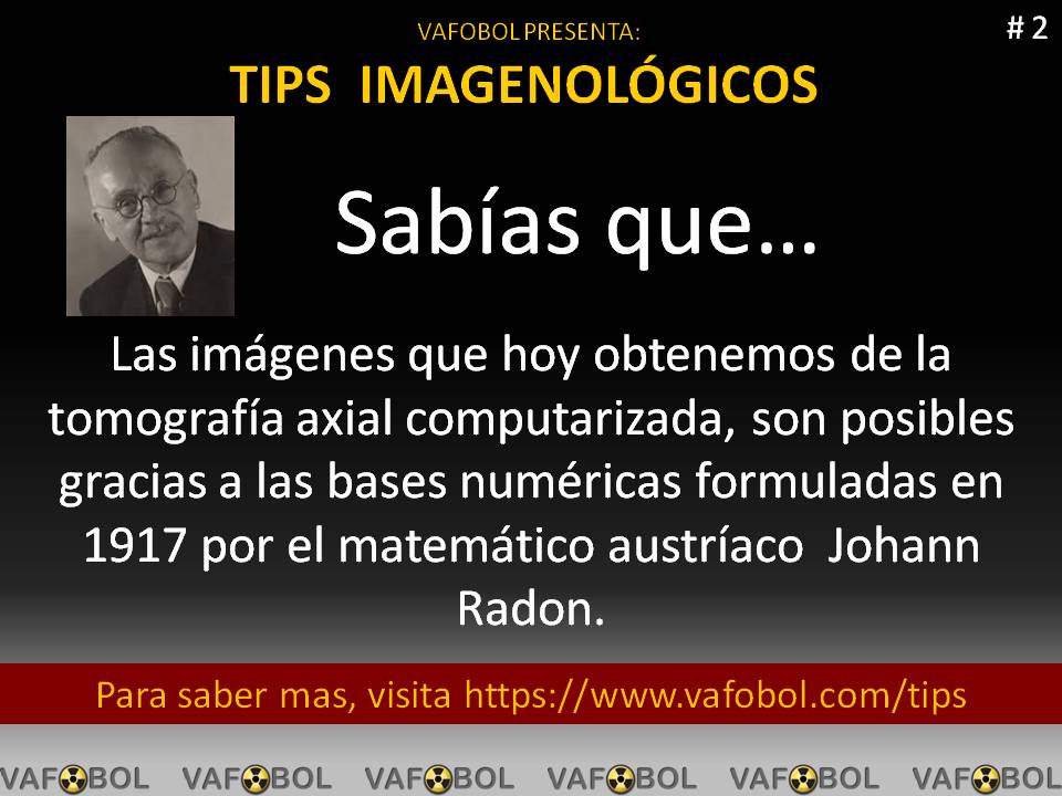 Bienvenidos a nuestra sección de tips imagenológicos. Sección dedicada a incrementar nuestra cultura y conocimientos de temas importantes y muy particulares del mundo de la imagenología, con el objeto de recordar hechos históricos trascendentales, y revisar la información más actual, ampliando así nuestros conocimientos.